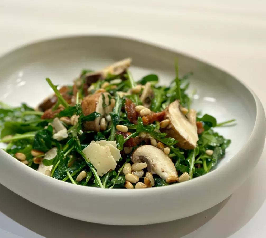 Ingrédients pour 4 personnes : 125 g de roquette et mélange de jeunes pousses de salade, 6 champignons bruns, 10 tomates séchées, 3 cuil à café de pignons de pin, 3 cuil à soupe de copeaux de parmesan, huile d'olive #azeitzdavila, basilic, ciboulette, 1/2 citron et 1 cuil à soupe de vinaigre balsamic.